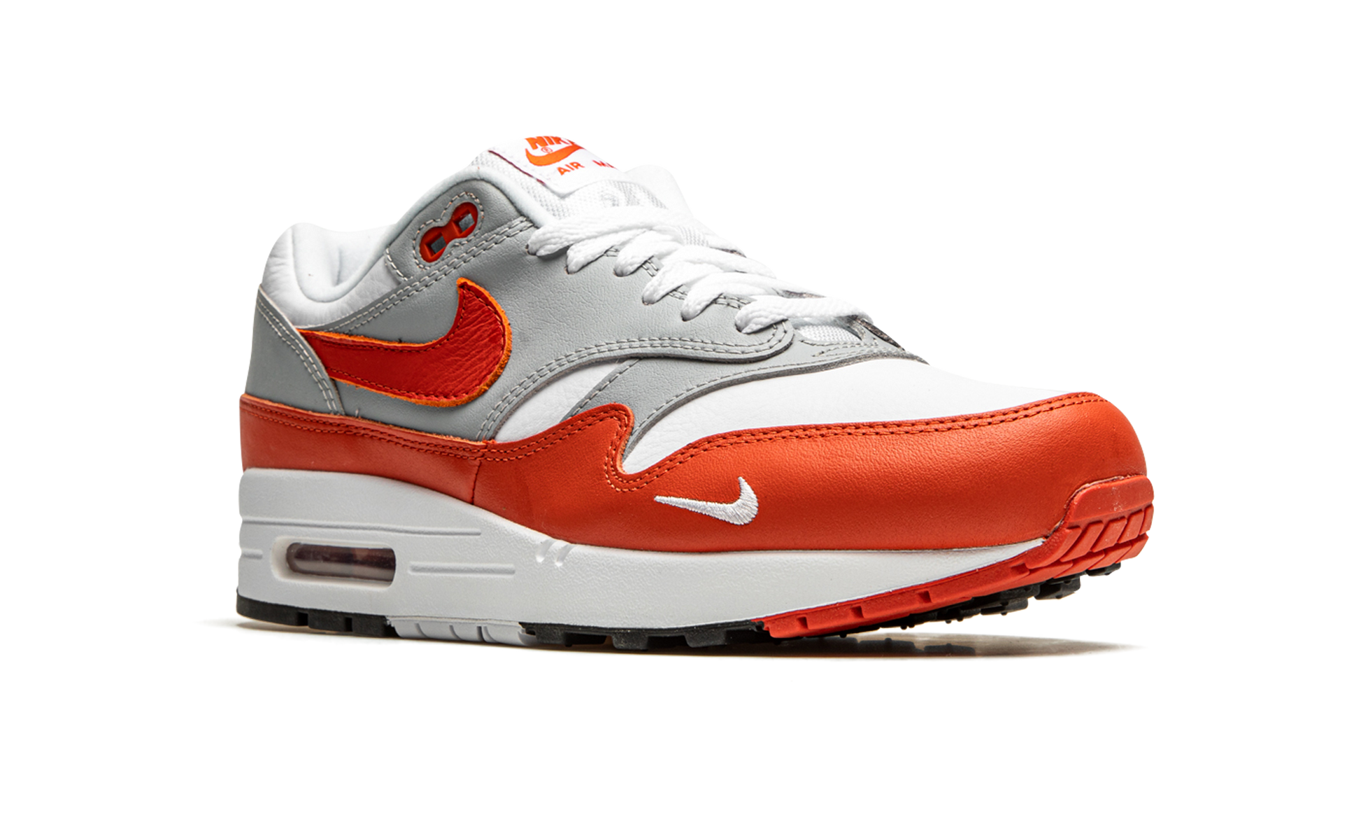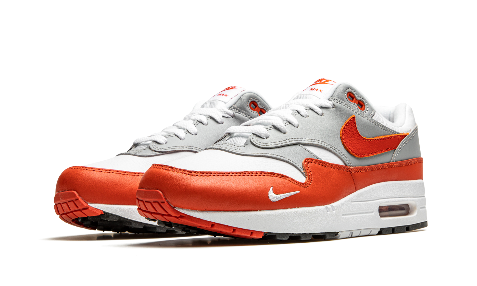 The Nike Air Max 1 “Martian Sunrise” is a premium look for the first-ever shoe to feature Nike’s signature Air Max technology. The brainchild of Nike shoe designer Tinker Hatfield that was originally released in 1987, the Air Max 1 is unquestionably one of the most influential silhouettes in sneaker history, having spawned too-many-to name iconic shoes featuring its patent visible Air technology. As for the styling of the “Martian Sunrise,” the construction features an elevated all-leather build, featuring a white leather base, grey overlays, and colorful reddish-orange "Martian Sunrise" accents on the Swooshes, mudguard, and branding hits. A mini Swoosh is embroidered in white at the toe. Consistent with original Air Max 1s, a small clear Air unit in the heel of the midsole finishes off the look. Release date: January 14, 2021. Martian Sunrise