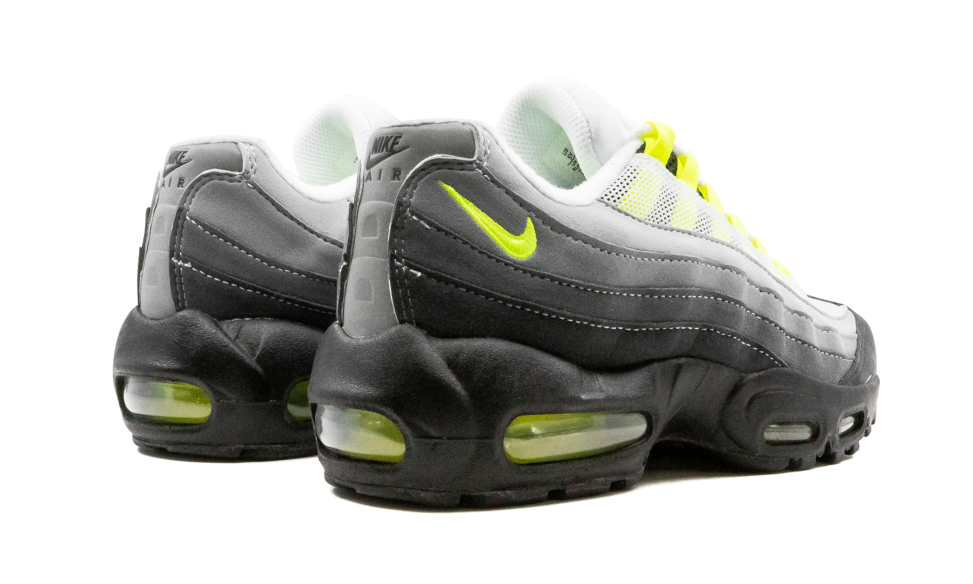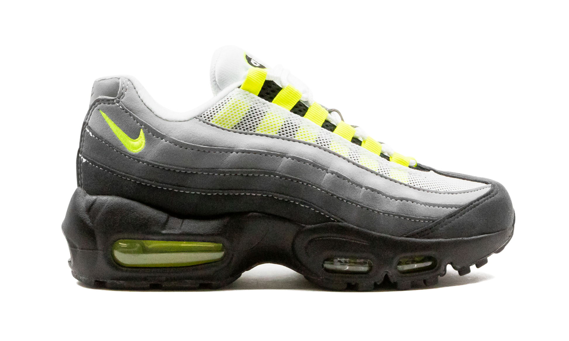 The Nike Air Max 95 GS “Neon” is the youth sizing of the iconic original colorway of the retro runner by Nike. The legendary Air Max 95 “Neon” returned in December 2020 as part of Nike’s dedication to bringing back some of its greatest Air Max models in original looks. The 2020 version of the shoe features many of the same “OG” design details as the pair from the ‘90s. White mesh can be found around the eyelets and a gradient light-to-dark grey suede design appears on either side. Neon accenting appears on the Swoosh embroidery on the heel, on the split “Air Max” logo on the tongue, and inside of the visible Air unit in the heel of the black rubber midsole. Reflective material is located on the tongue. Release date: December 17, 2020. Neon 2020